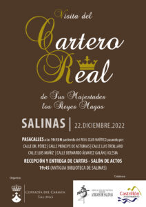 Visita, con pasacalles y recepción, a los niños de Salinas del Cartero Real de SSMM Los Reyes Magos de Oriente. La comitiva del Cartero Real saldrá desde el Real Club Náutico de Salinas pasando por las calles: Dr. Pérez, Príncipe de Asturias, Luis Treillard, Luis Muñiz y Bernardo Álvarez Galán hasta llegar a la Iglesia,...