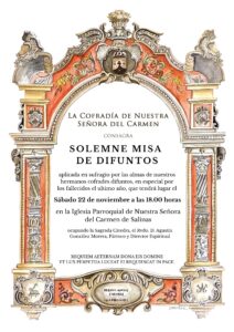Se consagra Solemne Misa por los hermanos cofrades difuntos, en especial, por los fallecidos durante el último año, el sábado 22 de noviembre a las 18:00 horas.
